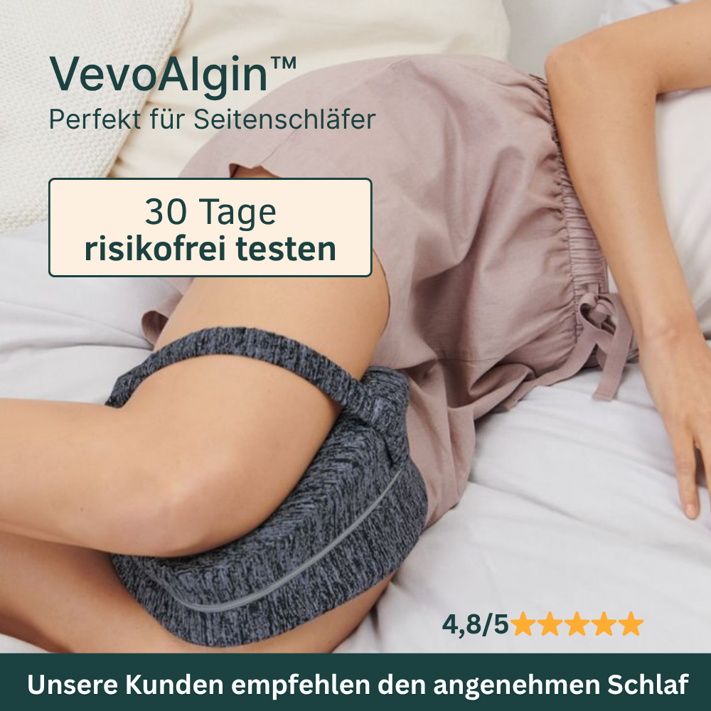 VevoAlgin™ hält deine Knie im Schlaf in der idealen Position, wodurch Becken und Wirbelsäule entlastet werden. So bleibt deine Wirbelsäule in einer geraden Linie, Muskelverspannungen werden reduziert, und du wachst erholter und ohne Schmerzen auf.